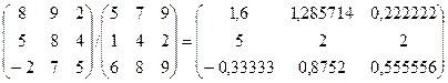 Аналогичным способом вычислим разность (-), произведение (*) и частное (/) этих матриц. Получим: