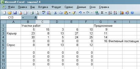 По свойству, если суммарное предложение < суммарного спроса, то вводят фиктивного поставщика. В нашем случае - фиктивный карьер, предложение которого будет равно 50 – 34 = 16. А транспортные затраты будут равны нулю.