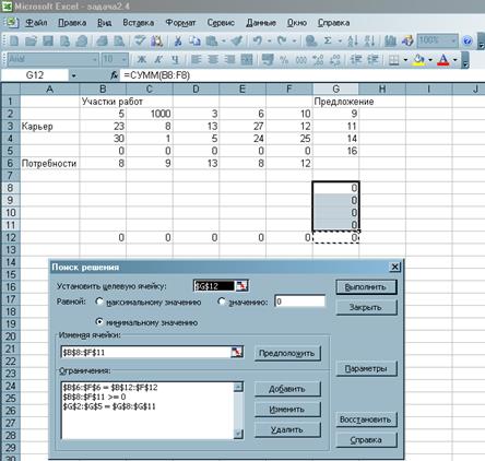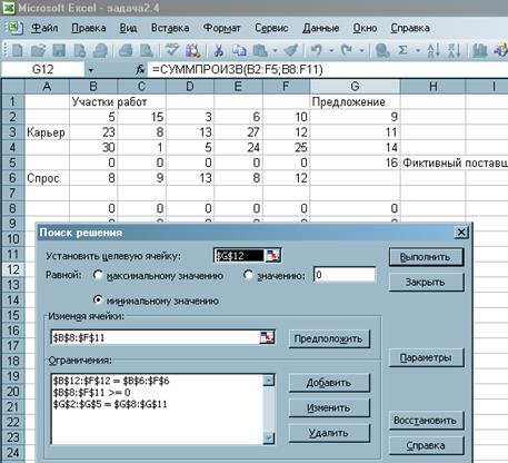 2.12 Определим, что произойдет с оптимальным планом, если появится запрет на перевозки от первого карьера до второго участка работ. Для этого в ячейку С2 введем большое число (например, 1000) и снова вызовем команду «Поиск решения» (рис. 14).