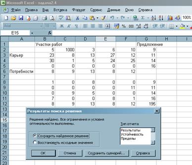 1.7 Теперь нужно нажать ОК, а потом - Выполнить. Появится диалоговое окно «Результаты поиска решения», где нужно указать типы отчетов (по результатам, устойчивости, пределам) и нажать ОК. Получим решение задачи (рис. 5).
