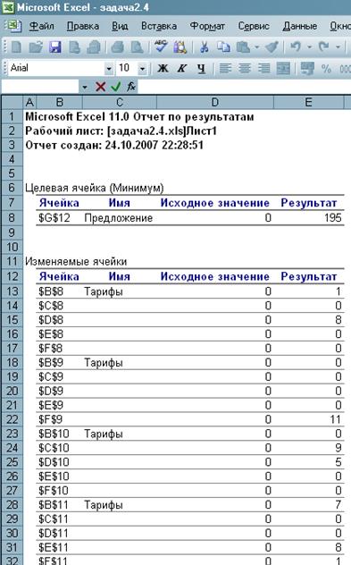 2.10 Теперь нужно нажать ОК, а потом - Выполнить. Появится диалоговое окно «Результаты поиска решения», где нужно указать типы отчетов (по результатам, устойчивости, пределам) и нажать ОК. Получим решение задачи (рис. 13).