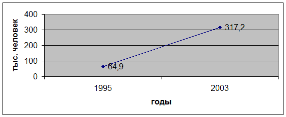 Согласно данным Госкомстата России, наиболее интенсивный рост наркотизации населения отмечался в 1995-1999 годах. Количество больных наркоманией, состоящих под диспансерным наблюдением, на конец 2003 года составило 317,2 тысячи человек, что почти в 5 раз больше, чем в 1995 году (64,9 тыс. человек) [3,6 и др.].