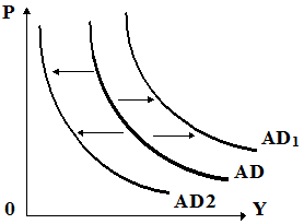 Основными составляющими совокупного спроса являются: потребительские расходы, инвестиции, государственные закупки и чистый экспорт. Изменения в совокупном спросе связаны с изменением какой-либо из этих составляющих или их совместным изменением. Графически изменение совокупного спроса интерпретируется смещением кривой совокупного спроса вправо (AD1 - рост совокупного спроса) или влево (AD2- его снижение).