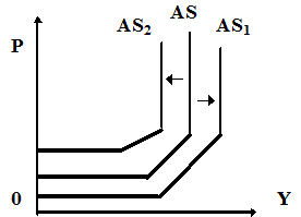 Эти факторы сдвигают кривую предложения влево (AS1 - при воздействии, увеличивающем предложение), или вправо (AS2 - при воздействии, снижающем предложение).