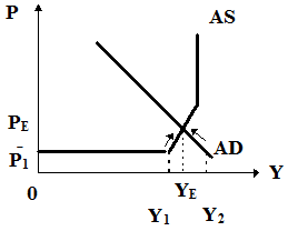 Равновесие на промежуточном отрезке формируется при уровне цен, равном PE . Равновесный объем производства - Y E . При цене P1 совокупный спрос превышает совокупное предложение на величину (Y2 - Y1 ) и конкуренция потребителей позволит поднять уровень цен до PE, что позволит увеличить реальный объем производства до Y E .