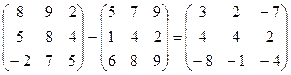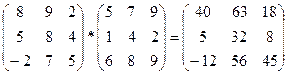 Аналогичным способом вычислим разность (-), произведение (*) и частное (/) этих матриц. Получим: