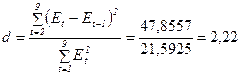 - независимости уровней ряда остатков по d-критерию (в качестве критических используйте уровни d1=1,08 и d2=1,36) или по первому коэффициенту корреляции, критический уровень которого r(1)=0,36;
