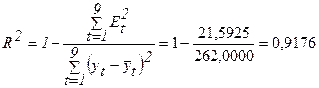 R2 показывает долю вариации результативного признака под воздействием изучаемых факторов. Следовательно, более 91,76 % вариации зависимой переменной учтено в модели и обусловлено влиянием включенного фактора.