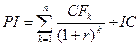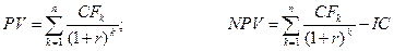 где IC – исходная инвестиция (отток средств); CFk – поступление в k-м базисном периоде; n – число базисных периодов, в течение которых будет эксплуатироваться проект; r – ставка дисконтирования, по которой элементы денежного потока будут приводиться к одному моменту времени
