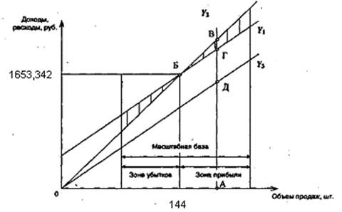 На оси абсцисс откладывается объем реализации (товарооборот) в натуральных единицах измерения, на оси ординат—затраты и доходы в денежной оценке. Точка пересечения этих прямых будет свидетельствовать о состоянии равновесия.