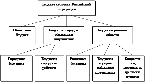 Таким образом, бюджет субъекта Российской Федерации состоит из областного бюджета, бюджета городов областного подчинения и бюджетов районов области. Бюджеты городов областного подчинения, в свою очередь, состоят из городских бюджетов и бюджетов городских районов. В бюджеты районов области входят районные бюджеты, бюджеты городов районного подчинения, а также бюджеты сел, поселков и других населенных пунктов.