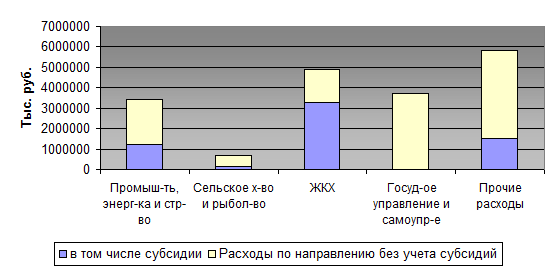 Основной составляющей нерациональных видов расходов на жилищно-коммунальное хозяйство являются субсидии – более половины всех расходов по статье. Расходы на субсидии ЖКХ превышают даже такие расходы, как расходы на промышленность, энергетику и строительство, сельское хозяйство и рыболовство, приблизительно равны расходам на государственное управление и самоуправление. Доля субсидий велика и в расходах на сельское хозяйство и рыболовство.