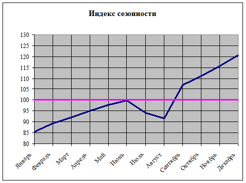 Для наглядного представления сезонной волны индексы сезонности изображают в виде графика. Построение графика основывается на результатах предыдущего пункта с использованием MS Excel XP. По оси Х откладываем месяца года, а по оси Y – величины индекса сезонности.