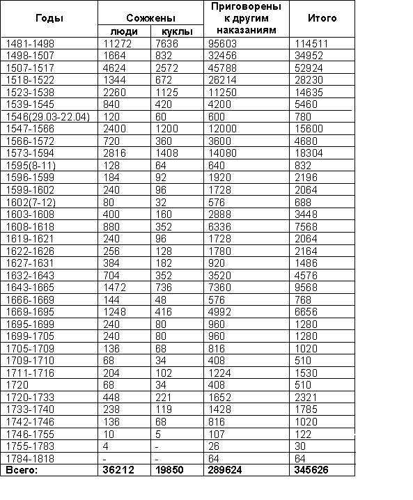Даже в Испании, где инквизиция особенно "свирепствовала", под руководствам испанских монархов, за 337 лет (с 1481 г. по 1818 г.) существования испанской инквизиции, по решению государственных судов было сожжено 36 212 человек, выданных инквизицией в руки государственной власти. А за 2 года Французской революции 1789 г. было уничтожено около 300 тыс. человек. За 3 года гражданской войны в Советской России только от революционных трибуналов погибло около 2 млн. человек. От рук германского национал-социализма только за годы второй мировой войны погибло (по еврейским источникам) около 6,5 млн. евреев. А сколько погибло людей от войн, болезней, нищеты, голода и других бедствий, наступивших от господства в Европе идеологий деизма, пантеизма, атеизма, расизма, сексуальной революции, абортов (в СССР перед "перестройкой" - 7 млн., в США - 1,5-2 млн. в год), наркомании, бесправия!!! Это наверно трудно подсчитать!