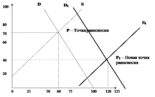 Предложение товара в этом случае повысится, а цена товара понизится и появится новая точка равновесия - Р1 (см. рисунок). 80 + р = 200 – 2р. р = 40; q = 120. Объем дотационных выплат равен 90 руб. * 60 ед. = 5400 руб.
