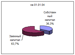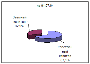 Структура пассивов изменилась: на 01.07.04 г. доля собственного капитала в источниках формирования хозяйственных средств составила 67,1%, а доля заемного капитала 32,9% (Рисунок 1).