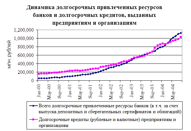 Вместе с ростом доверия к институтам финансового рынка, они не только аккумулировали внутренние сбережения, но и обеспечили трансформацию части накоплений в инвестиции в основные фонды. Объем финансовых ресурсов, привлекаемых российскими предприятиями на финансовом рынке, за последние годы вырос в несколько раз. Так, объем предоставленных предприятиям российскими коммерческими банками кредитов за период с 1 января 2000 года по 1 июля 2004 года вырос на 2,2 трлн. рублей (т.е. почти в 6 раз, при этом объем долгосрочных, на срок более 1 года, кредитов вырос за этот же период на 816 млрд. рублей). Еще 276 млрд. рублей долгосрочных инвестиций за тот же период российские предприятия привлекли на внутреннем рынке ценных бумаг. На внешних рынках ценных бумаг российскими предприятиями было привлечено 19,9 млрд. долл. или 570 млрд. руб. долгосрочных заемных ресурсов. В итоге за четыре года финансовый сектор предоставил российским компаниям для финансирования инвестиций свыше 3 трлн. руб., в том числе 1,7 трлн. руб. – долгосрочных. Если учесть, что за четыре года объем инвестиций в основные фонды за счет всех источников составил около 9 трлн. руб., то финансовые рынки на треть пополнили финансовую базу для модернизации экономики.