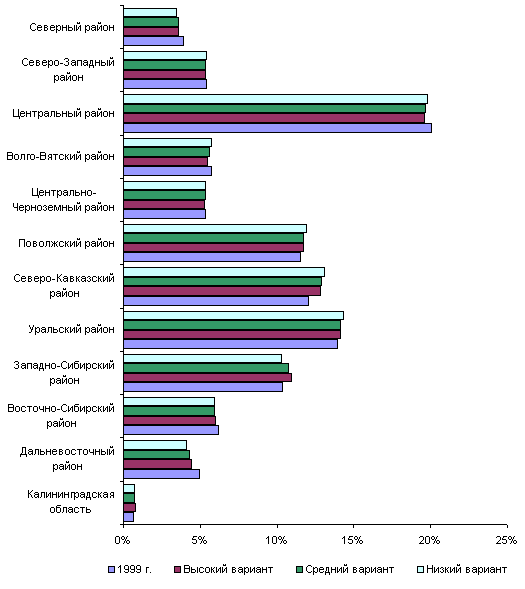 Независимо от варианта к 2021 г. заметно уменьшится доля населения России, проживающего в Дальневосточном, Восточно-Сибирском, Северном и Волго-Вятском районах и, относительно в меньшей степени, в Центральном районе. Наибольший относительный рост доли населения ожидает Калининградскую область и Северо-Кавказский район (расчеты не учитывают возможные последствия войны в Чечне), а также Уральского района. Доля Западно-Сибирского района возрастет при высоком и среднем сценариях и останется неизменном – при низком. Практически не изменится доля в населении России Северо-Западного и Центрально-Черноземного районов.