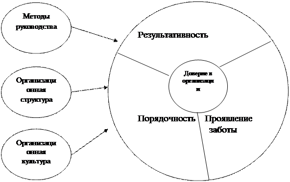 Из схемы видно, как три «ключа» к доверию в организации связаны с ее организационной структурой и методами управления. Уровень доверия не только связан, но и просто неотделим от поведения руководителей организации.