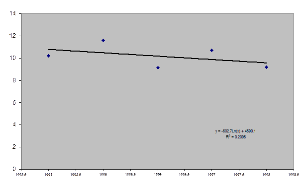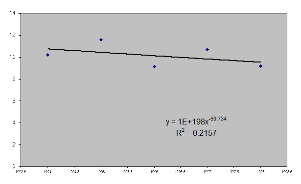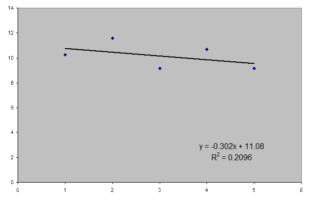 При использовании метода аналитического выравнивания динамического ряда и отображения результатов графически можно сразу проследить тенденцию снижения валовой продукции растениеводства в сопоставимых ценах 2004 г. на 1 чел.-ч прямых затрат труда, р/чел.-ч.