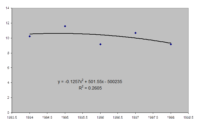Значение В показывает, что при увеличении времени на 1 год валовая продукция растениеводства снижается на 0,302 р/чел-часов.