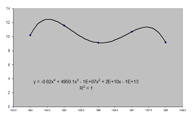 Наилучшее приближение достигается полиномом четвертой степени ( коэффициент детерминации равен 1).