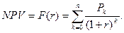 Для наглядного понимания природы вышеперечисленных критериев рассмотрим график чистой приведенной стоимости, который является одним из наиболее полезных инструментов для суммарного выражения характеристик доходности инвестиции. Критерий NPV можно представить как функцию от ставки дисконтирования: