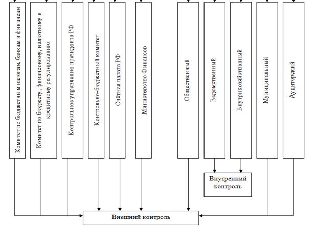 Государственный вневедомственный финансовый контроль осуществляется следующими контрольными органами: Счетной палатой РФ и контрольно-счетными органами субъектов РФ, Главным контрольным управлением Президента РФ, Департаментом государственного финансового контроля (ДГФК) Минфина России, Главным управлением федерального казначейства (ГУФК) Минфина России, Центральным банком РФ, Министерством РФ по налогам и сборам, Государственным таможенным комитетом РФ, Федеральной службой налоговой полиции РФ и государственными внебюджетными фондами — Пенсионным фондом РФ (ПФ РФ), Фондом социального страхования РФ (ФСС РФ), Федеральным и территориальными фондами обязательного медицинского страхования (ФФОМС и ТФОМС).