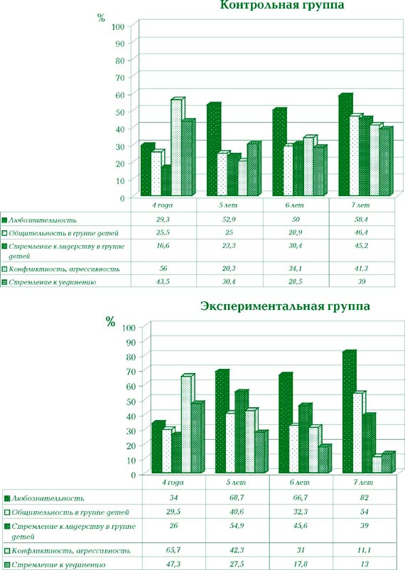 Результаты проведенного исследования выявили преимущество экспериментальной группы в проявлении социальной адаптации, уровня комфортности и психологической раскованности на всех возрастных этапах (рис. 1).