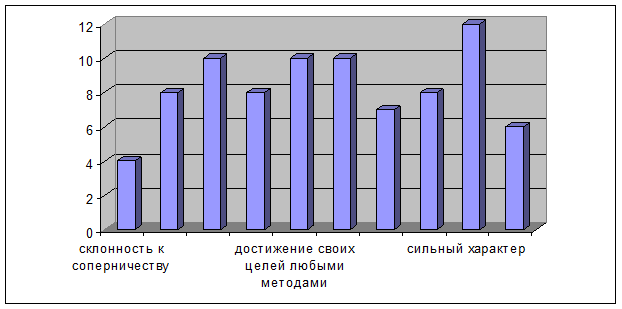 В анкете каждая из этих четырех деловых характеристик конкретизировалась такими чертами характера, как склонность к соперничеству, подавление других, навязывание своего мнения, стремление быть всегда и во всем первым, достижение своих целей любыми методами, целеустремленность, сила воли, стремление к руководству людьми, сильный характер, эгоизм. Важность каждой из черт характера для каждой из деловых характеристик руководителя оценивалось сотрудниками по трехбалльной шкале: