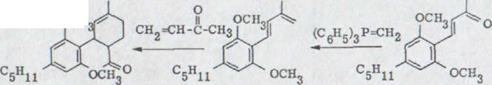 Körte15) описывал второй путь синтеза (схема 3). Конденсация алдола от масляного альдегида XVII с ацетоном ведет при одновременном отделении воды к замененному ядру Бензалакетона XVIII, которое может осуществляться в виде реакции XIX. Он реагирует в одной сопутствующей реакции с винил-метил-кетоном как неотъемлемый компонент к кетону XX. Новое масляное расщепление каннабиола-диметил эфира с метилмагниемсиумйодидоми и выделение такого полученного изомерного каннабидиола ведет к водородному распределению с 9,5% выходом каннабидиола.