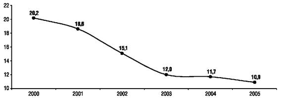 для нефинансовых предприятий - с 23,8% до 10,8%. Причем в 2004-2005 гг. она