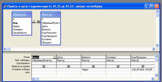 Созданные запрос выдаст следующие данные об обменных пунктах и датах, в которых курс продажи евро составлял от 34,25 до 34,55 рубля:
