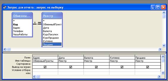 Создадим простой запрос, добавив в бланк запроса поле Адрес из таблицы ОбменныеПункты и поля Дата, Валюта, Куплено и КурсПродажи из таблицы Реестр.