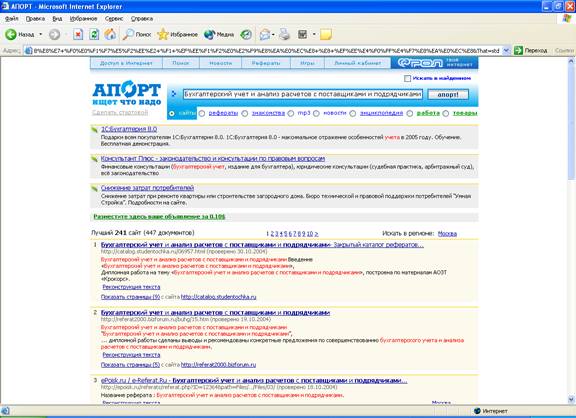 Теперь аналогичным образом осуществим поиск WEB-страниц, на которых рассматриваются вопросы, касающиеся Бухгалтерский учет и анализ расчетов с поставщиками и подрядчиками.