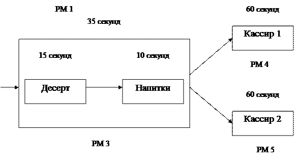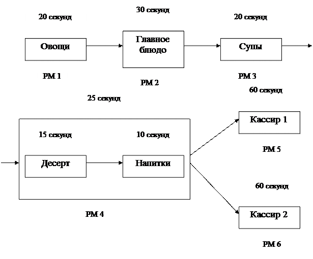 Рабочее место (РМ) 4 включает одного работника, который обслуживает десертными блюдами (15 секунд) и напитками (10 секунд). Проблема заключается в том, что линия обслуживания плохо сбалансирована. Рабочее место 5, работа кассира, требует 60 секунд на каждого потребителя в среднем, означая, что за час можно обслужить только 60 потребителей. Другой сотрудник простаивает примерно 30-40 секунд каждую минуту или в течение «цикла» обслуживания потребителя.
