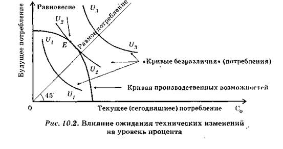 Кривая производственных возможностей показывает, как экономия может трансформировать текущее потребление в будущее. Касательная в точке Е есть точка, максимизации потребления. Наклон двух “кривых безразличия” выше и ниже точки равновесия Е соответствует минусу (1+r), где r – реальный уровень процента или доход потребления товаров завтра как жертва сегодняшнего (текущего) потребления.