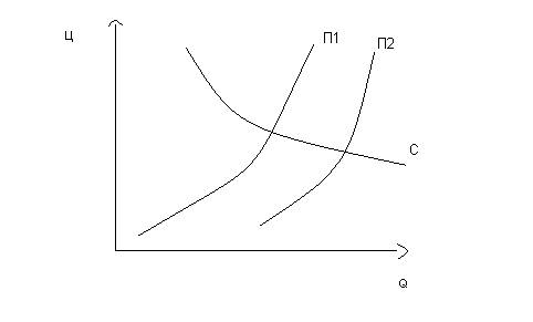 Из сказанного можно сделать вывод о действии такой модели ценообразования, которая устанавливает функциональную зависимость между ценой, с одной стороны, и спросом и предложением—с другой. Эта функциональная зависимость спроса или предложения от изменения цены выражается кривой цен спроса ( С) и кривой цен предложения (П). Если на оси ординат откладывать цены, а на оси абсцисс количество спрашиваемого и предлагаемого товара, то кривая С выражает зависимость изменения спроса от динамики цен, а кривая П— зависимость изменения предложения от динамики цен. Спрос находится в обратной, а предложение —в прямой зависимости от изменения цен, о чем свидетельствуют кривые Си П.