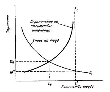 Рис. 4 иллюстрирует явление уклонения на рынке труда. Спрос на труд DL, как правило, убывающая кривая. Если бы этого явления не возникало, то пересечение DL с кривой предложения труда (SL) дало бы рыночную заработную плату w* и полную занятость (L*). Однако учитывая уклонение, фирмы не согласны платить w*. Им выгоднее назначить более высокую оплату при любом уровне безработицы, с тем чтобы работники стали эффективнее трудиться. Данный уровень оплаты выражен в форме кривой, соответствующей ограничению на отсутствие уклонений (NSC). Эта кривая показывает, какова минимальная величина зарплаты, при которой работники перестают уклоняться от работы, для каждого уровня безработицы. Заметим, что, чем больше данный уровень, тем меньше разница между эффективной зарплатой и w*. Это объясняется тем, что при высокой безработице лица, уклоняющиеся от своих обязанностей, рискуют долго не найти