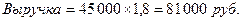 1. Рассчитаем объем выручки при условии, что компания продала в среднем 45 000 наименований товара по средней цене 1,8 руб. за единицу. Находим выручку по формуле:
