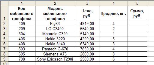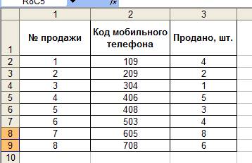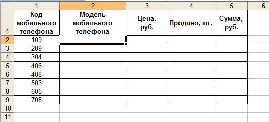 7. На рабочем листе Список продаж MS Excel создать таблицу, в которой будет содержаться список кодов проданных телефонов, количество и номер продажи.