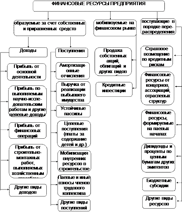 Финансовые ресурсы предприятия — это денежные доходы и поступления, находящиеся в распоряжении субъекта хозяйствования и предназначенные для выполнения финансовых обязательств, осуществлению затрат по расширенному воспроизводству и экономическому стимулированию работающих (1, стр. 121). Формирование финансовых ресурсов осуществляется за счет собственных и приравненных к ним средств, мобилизации ресурсов на финансовом рынке и поступления денежных средств от финансово банковской системы в порядке перераспределения.