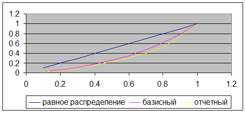 Расслоение населения по уровню дохода за рассматриваемый период возросло, поскольку отклонение кривой Лоренца от линии равномерного распределения изменилась в сторону увеличения площади образованной этой кривой и линией равномерного распределения.