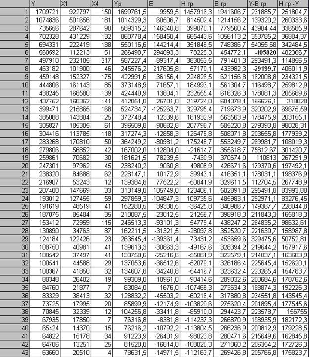 По данным, представленным в табл. 1, исследуется зависимость между Y - совокупной выручкой за 2004 год, (тыс. руб.) и следующими четырьмя основными факторами: