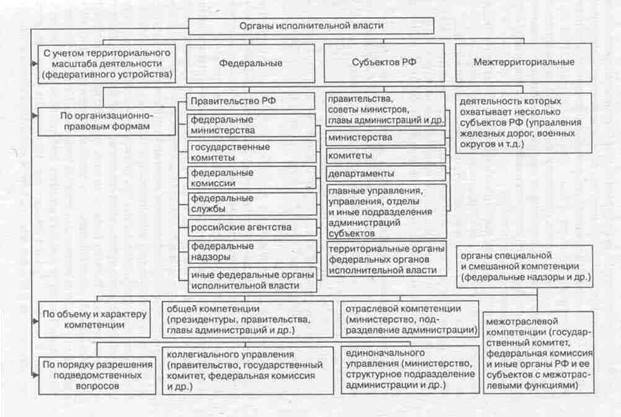 В зависимости от объема и характера компетенции органы исполнительной власти подразделяются на: а) органы общей компетенции, осуществляющие руководство на подведомственной территории всеми или подавляющим большинством отраслей управления и сфер деятельности (президентуры, правительства, главы администраций, губернаторы субъектов Федерации); б) органы отраслевой компетенции, на которые возложено руководство отдельными отраслями управления или сферами деятельности (министерство, структурное подразделение администрации); в) органы межотраслевой компетенции, которые ведают специальными вопросами управления, имеющими межотраслевое значение (государственный комитет, федеральная комиссия и аналогичные органы субъектов Федерации). Из их числа иногда выделяют органы специальной и смешанной компетенции, т.е. сочетающие признаки органов отраслевой и межотраслевой компетенции (федеральные надзоры, агентства и др.).