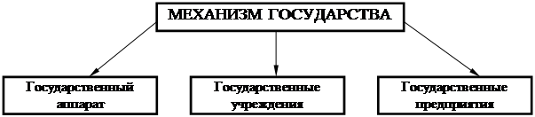 На наш взгляд, понятие "механизм государства" более полно раскрывает содержание материальных и организационных средств реализации государственной власти. Он может использоваться в широком и узком смысле. В широком смысле механизм государства включает в себя всю совокупность государственных органов, посредством которых осуществляются задачи и функции государства. При таком понимании механизм государства состоит из государственного аппарата, государственных учреждений и государственных предприятий.[2]