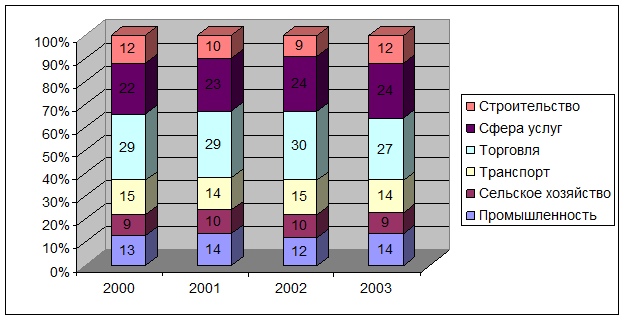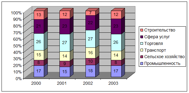 Охарактеризуем структуру выданных банком кредитов за 2000-2003 годы и структуру невозвращенных кредитов. На листе 2 раздаточного материала приведена структура выданных и невозвращенных кредитов по отраслям коммерческой деятельности предприятий.