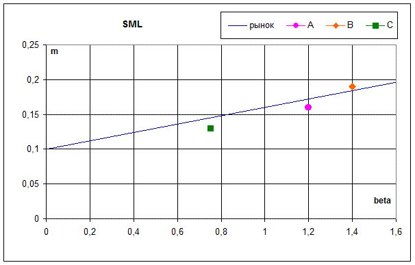 Т. к. α1 и α3 < 0, то акции A и C – недооценены. α2 > 0 – акция B переоценена.