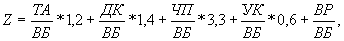 Z2001=1,2*213193/808058+1,4*55967/808058+3,3*302242/808058+0,6* *30740/808058+975270/808058=2,878