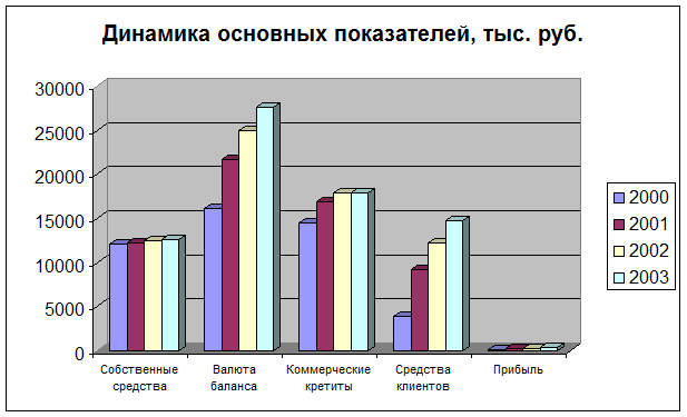 Аналитический баланс за 4 года (2000-2003) приведен в Приложении 2 к настоящей дипломной работе. Проиллюстрируем динамику основных статей баланса, таких как собственные средства, валюта баланса, величина коммерческих кредитов, средства клиентов, валовая прибыль.